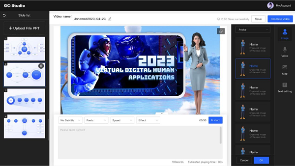 GC-Studio通過最大限度減少傳統(tǒng)視頻制作的人工介入,有效降低使用門檻、提升交互體驗,大幅節(jié)約了人力資源和物力消耗。企業(yè)只需設置數(shù)字人參數(shù),即可獲得一個適合公司形象的、專業(yè)的、可24小時無間斷工作的數(shù)字講解員。