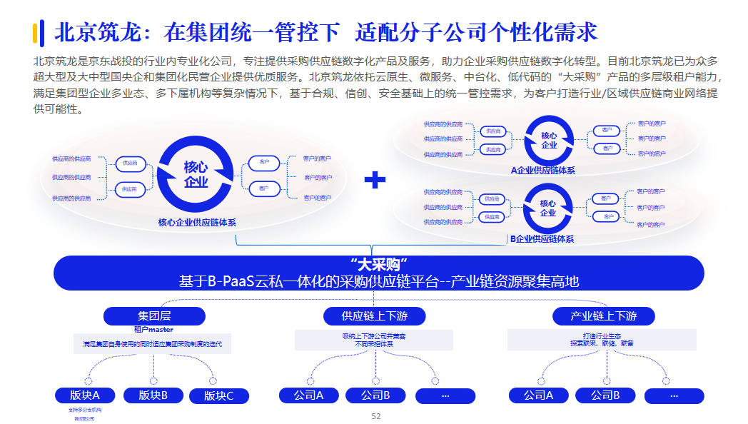 針對企業(yè)既要滿足標(biāo)準(zhǔn)化,又要滿足定制化業(yè)務(wù)需求,PaaS提供的服務(wù)更具有拓展性、集中性、適配性更強(qiáng)。北京筑龍基于多租戶體系,構(gòu)建了大采購云私一體化B-PaaS平臺,既滿足多層級集中管理管控需求,又為下屬管理及執(zhí)行機(jī)構(gòu)提供更多個性化、自主性選擇,進(jìn)而適應(yīng)集團(tuán)多元化和業(yè)務(wù)單元專業(yè)化發(fā)展。