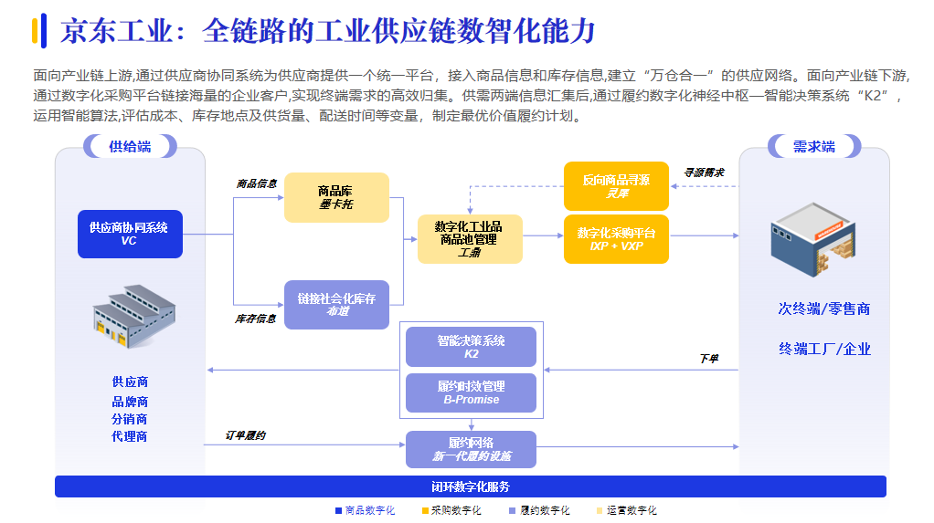 數(shù)字供應(yīng)鏈發(fā)展已經(jīng)從關(guān)注部分環(huán)節(jié)、部分參與者,轉(zhuǎn)向關(guān)注全鏈條、生態(tài),因此,全鏈路數(shù)智供應(yīng)鏈解決方案漸成主流。例如,京東工業(yè)面向產(chǎn)業(yè)鏈上下游,通過供應(yīng)商協(xié)同系統(tǒng)建立“萬倉合一”的供應(yīng)網(wǎng)絡(luò);通過數(shù)字化采購平臺實(shí)現(xiàn)終端需求的高效歸集,再通過智能決策系統(tǒng)“K2”,制定最優(yōu)價值履約計劃。