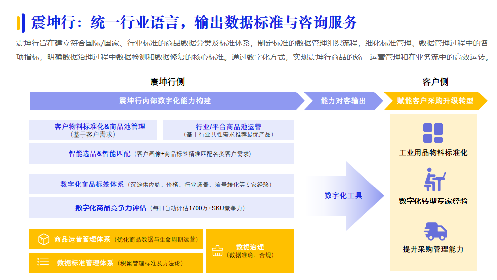 為企業(yè)提供場景、行業(yè)適配的產(chǎn)品與服務(wù)是供應(yīng)商的基礎(chǔ)能力??梢越柚鶤I等數(shù)字化技術(shù)服務(wù),基于場景梳理的標(biāo)準(zhǔn)化實(shí)現(xiàn)商品智能匹配,已經(jīng)成為供應(yīng)商服務(wù)升級的方向。例如:震坤行通過建立國際/國家、行業(yè)標(biāo)準(zhǔn)的商品數(shù)據(jù)分類及標(biāo)準(zhǔn)體系,明確數(shù)據(jù)治理過程中數(shù)據(jù)檢測和數(shù)據(jù)修復(fù)的核心標(biāo)準(zhǔn),再基于場景梳理,建立數(shù)字化商品標(biāo)簽體系,實(shí)現(xiàn)震坤行商品的統(tǒng)一運(yùn)營管理和在業(yè)務(wù)流中的高效運(yùn)轉(zhuǎn)。