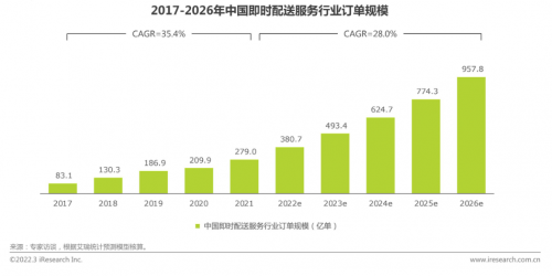 據(jù)艾瑞咨詢(xún)《2022年中國(guó)即時(shí)配送行業(yè)報(bào)告》顯示,2021年,即時(shí)配送服務(wù)行業(yè)訂單規(guī)模為279億單。未來(lái)伴隨即時(shí)配送服務(wù)價(jià)值進(jìn)一步凸顯,預(yù)計(jì)2026年,即時(shí)配送服務(wù)行業(yè)訂單規(guī)模將接近千億量級(jí) ,達(dá)到957.8億單,2021年-2026年年復(fù)合增速為28.0%,行業(yè)整體仍處于快速發(fā)展路線上。