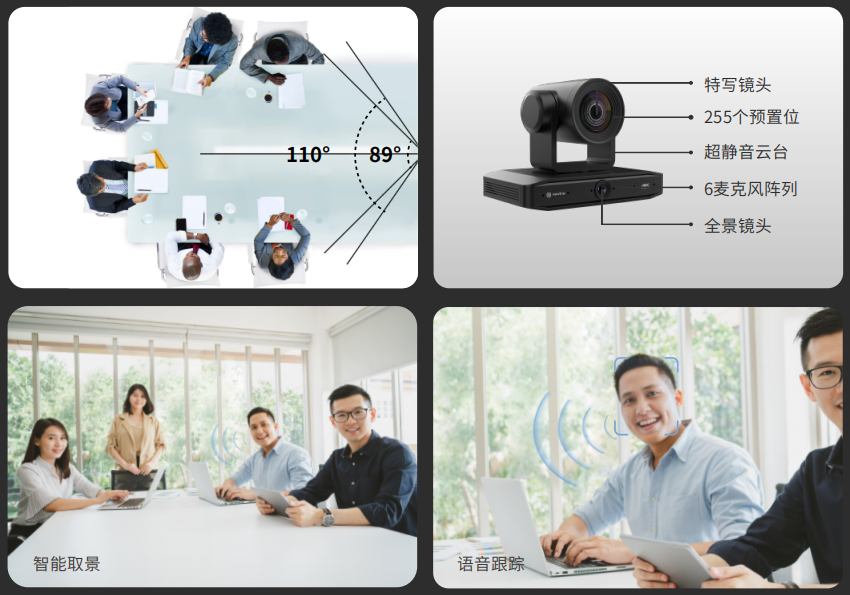 攝像系統(tǒng)由12倍光學(xué)變焦特寫鏡頭和110°大廣角的全景鏡頭組成,特寫鏡頭可視角達(dá)89°,可將畫面無損放大至12倍,加上自動對焦,不僅能捕捉所有參會人的表情和動作,會議室中的文件和白板內(nèi)容都能在遠(yuǎn)端輕松觀看。同時,作為一款會議云臺攝像頭,它能通過6顆麥克風(fēng)陣列,鎖定發(fā)言人位置,電機(jī)實時穩(wěn)定安靜快速地運(yùn)行轉(zhuǎn)動到當(dāng)前發(fā)言人,覆蓋會議室多個角度,讓遠(yuǎn)程的參會人更具沉浸感和參與感。