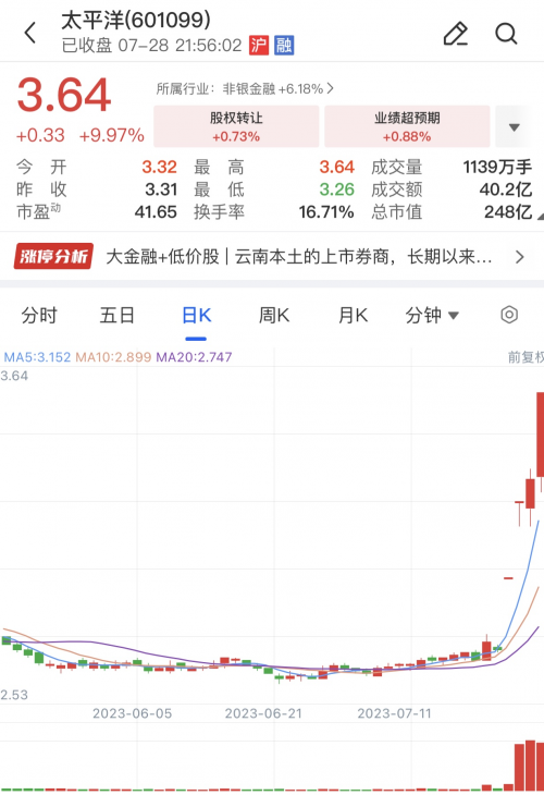 7月28日,太平洋證券再次漲停,截至收盤,成交40.24億元,換手率為16.71%,買一封單107.42萬手,以當(dāng)日收盤價(jià)3.64元計(jì)算,約3.91億元。太平洋錄得“四天三漲?!?#xff0c;近4個(gè)交易日上漲36.84%,累計(jì)成交118.93億元。最新總市值為248.1億元,較7月23日收盤市值增加66.8億元。