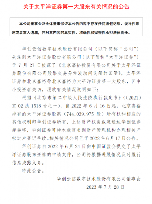 7月28日,華創(chuàng)云信發(fā)布公告稱,根據(jù)法院執(zhí)行裁定書,自2022年6月16日起,北京嘉裕持有的太平洋證券股票7.44億股所有權(quán)和相應(yīng)的其他權(quán)利歸華創(chuàng)證券所有,上述財(cái)產(chǎn)權(quán)自裁定送達(dá)華創(chuàng)證券起轉(zhuǎn)移,華創(chuàng)證券可持本裁定書到財(cái)產(chǎn)管理機(jī)構(gòu)辦理相關(guān)產(chǎn)權(quán)過戶登記手續(xù)。