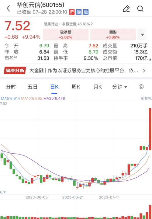 作為太平洋證券7.44億股股權(quán)的收購方,華創(chuàng)證券母公司華創(chuàng)云信(原華創(chuàng)陽安)同樣出現(xiàn)大漲,截至28日收盤,日內(nèi)成交15.28億元,換手率為9.3%,買一封單為9.23萬手,近4個(gè)交易日累計(jì)上漲14.81%,最新市值為170.06億元。