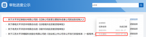 證監(jiān)會(huì)政務(wù)服務(wù)平臺(tái)顯示,太平洋證券主要股東或者公司的實(shí)控人變更仍處于補(bǔ)正通知狀態(tài),該狀態(tài)的完成日期為“2022-07-04”,接收材料時(shí)間為“2022-06-27”。