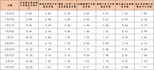 從全國(guó)來(lái)看,當(dāng)前國(guó)內(nèi)夏季水果供應(yīng)較為充足,近期國(guó)內(nèi)水果交易價(jià)格整體處于較低水平,本期農(nóng)業(yè)農(nóng)村部監(jiān)測(cè)的6種重點(diǎn)監(jiān)測(cè)水果價(jià)格跌幅收窄。截至7月31日,農(nóng)業(yè)農(nóng)村部監(jiān)測(cè)的6種水果(富士蘋果、巨峰葡萄、香蕉、菠蘿、西瓜、鴨梨)批發(fā)均價(jià)報(bào)7.35元/公斤,較7月24日下跌0.94%。