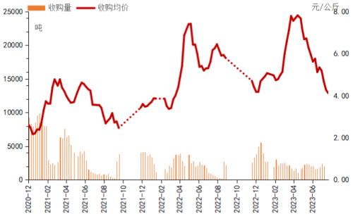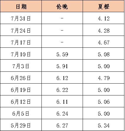在產(chǎn)地收購(gòu)方面,截至7月27日,秭歸夏橙已銷售本產(chǎn)季產(chǎn)量的59.38%,走貨速度整體低于去年同期。受降雨天氣影響,貿(mào)易商采購(gòu)意愿減弱,夏橙收購(gòu)價(jià)格及收購(gòu)量下降。本期秭歸夏橙收購(gòu)量環(huán)比下跌17.49%。價(jià)格方面,本期夏橙收購(gòu)價(jià)格報(bào)4.12元/公斤,環(huán)比下跌3.69%,同比下跌34.10%。