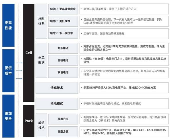 材料從根本上決定著電池性能。通過改進(jìn)材料提高電池性能、優(yōu)化電池老化機(jī)制、應(yīng)用新型材料、改變電芯結(jié)構(gòu)是電芯研發(fā)的主要方向。 例如,材料體系方面,采用新型材料體系(高鎳正極、硅基負(fù)極、鋰金屬負(fù)極、固態(tài)電解質(zhì)等),提高單體能量密度;或者研制出磷酸錳鐵鋰,探索鈉離子電池的商業(yè)化應(yīng)用,降低成本;或者加快固態(tài)電池的研發(fā)進(jìn)程,使電池性能更高,更耐久。電芯形狀方面,方形電池,尤其是LFP短刀兼顧性能、集成與制造,成為主流企業(yè)的優(yōu)選方案之一;大圓柱電池也是熱門方向,特斯拉和寶馬均已提出具體的實(shí)施規(guī)劃??斐浼夹g(shù)方面,多家主機(jī)廠開始導(dǎo)入800V高電壓平臺,并聯(lián)合電池企業(yè)推出2C~4C快充方案。