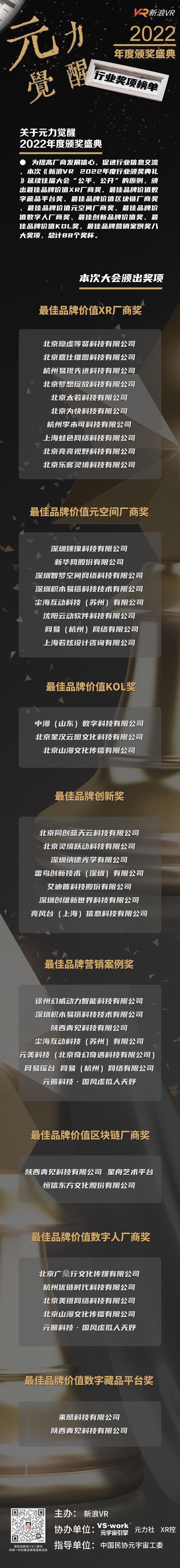 為提高廠商發(fā)展信心,促進(jìn)行業(yè)信息交流,本次《新浪VR 2022年度行業(yè)頒獎(jiǎng)典禮》延續(xù)往屆大會(huì)“公平、公開(kāi)”的原則,頒出最佳品牌價(jià)值XR廠商獎(jiǎng)、最佳品牌價(jià)值數(shù)字藏品平臺(tái)獎(jiǎng)、最佳品牌價(jià)值區(qū)塊鏈廠商獎(jiǎng)、最佳品牌價(jià)值元空間廠商獎(jiǎng)、最佳品牌價(jià)值數(shù)字人廠商獎(jiǎng)、最佳創(chuàng)新品牌價(jià)值獎(jiǎng)、最佳品牌價(jià)值KOL獎(jiǎng),最佳品牌營(yíng)銷案例獎(jiǎng)八大獎(jiǎng)項(xiàng),總計(jì)44個(gè)數(shù)字獎(jiǎng)杯。