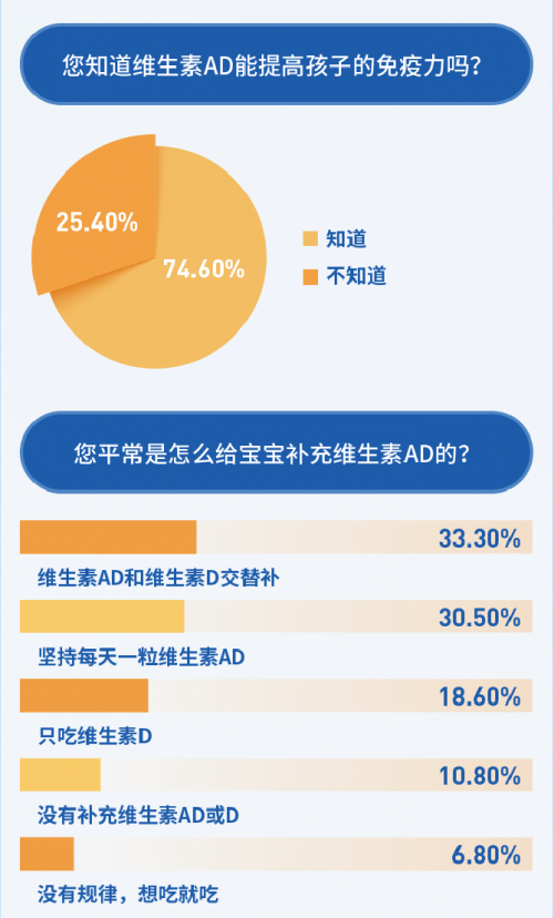 調(diào)查報告還顯示,雖然7成的家長認(rèn)可維生素AD對提高免疫力的作用,但有7成的家長用錯了方法,比如選擇AD和D交替補、只補D不補A、補補停停等。專家提醒,家長一定要重視孩子日常營養(yǎng)的攝入,堅持每天補充維生素AD是最佳方案。