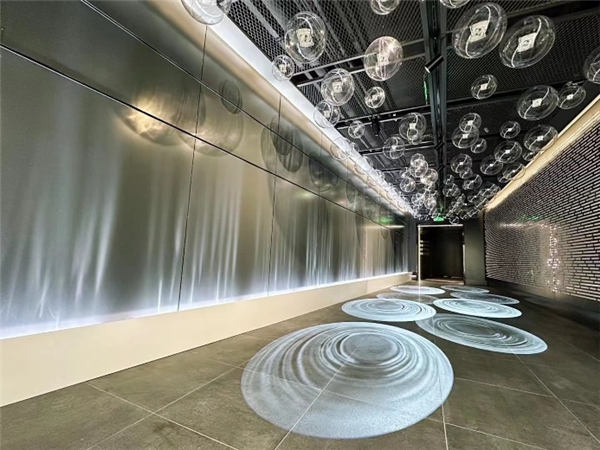 【水影】長(zhǎng)廊通過水滴掛墜、漣漪投影及名言墻打造沉浸式光影體驗(yàn)