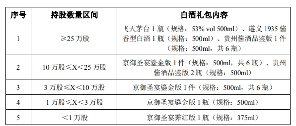 根據(jù)活動(dòng)安排,吉宏股份持股25萬(wàn)股以上的股東收到的白酒禮包將包括:飛天茅臺(tái)1瓶(規(guī)格:53%?vol?500ml)、遵義1935醬香型白酒1瓶(規(guī)格:500ml)、貴州醬酒品鑒版1件(規(guī)格:500ml,共6瓶)。
