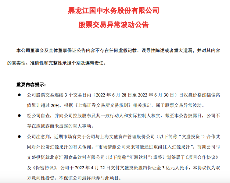 6月30日晚間,國中水務發(fā)布《股票交易異常波動公告》稱,公司注意到,近期市場有關于公司與文盛投資合作共同對外投資匯源果汁的有關傳聞:“市場猜測公司未來可能通過重組注入?yún)R源果汁”。經(jīng)公司核查如下:前期公司與文盛投資就匯源飲料重整計劃簽署了《項目合作協(xié)議》及《保密協(xié)議》,公司于2022年4月22日支付文盛投資履約保證金3億元,本協(xié)議僅為雙方意向性投資,不保證公司最終能參與此項目。