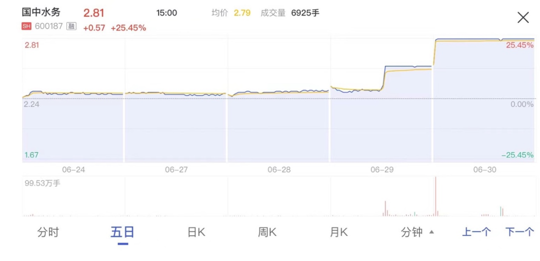 數(shù)據(jù)顯示,6月29日和30日,主營業(yè)務為污水處理、自來水供應和環(huán)保工程技術服務的國中水務股價連續(xù)兩日收于漲停,因有市場消息稱“公司未來可能通過重組注入?yún)R源果汁”。
