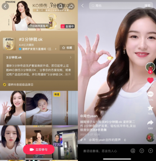 回顧此次活動,抖音電商超級品牌日深入洞察生活方式變化,結(jié)合潘婷品牌理念和新品發(fā)布,經(jīng)由明星與頭部達(dá)人參與#3分鐘就OK 挑戰(zhàn)賽、明星出席發(fā)布會、抖音微博熱搜引流、站內(nèi)主播實(shí)力帶貨,基于抖音全域興趣電商生態(tài)優(yōu)勢,幫助品牌實(shí)現(xiàn)品效合一。