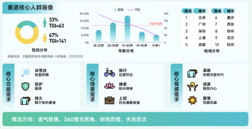 防曬衣賽道解讀:搜索量同比增長 161.4%,遠(yuǎn)高于行業(yè)整體,該賽道上半年搜索量逐漸上升,下半年搜索量逐漸下降,6月份搜索量最高。興趣群體以女性為主,31-40 歲人群占比高,用戶集中在一線和高溫天氣多發(fā)城市。未來,防曬衣可能會更加注重輕盈防曬、持久等功能,為消費(fèi)者提供更好的防護(hù)和穿著體驗(yàn),并向輕薄、智能等方向發(fā)展。