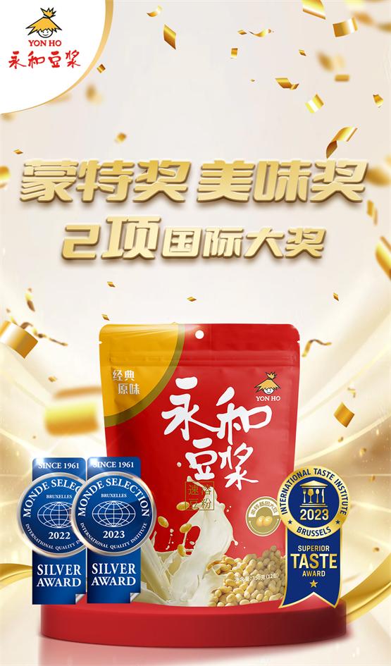 40年品質(zhì)經(jīng)營,永和食品多次榮獲全國產(chǎn)品和服務(wù)質(zhì)量誠信示范企業(yè)、全國質(zhì)量檢驗信得過產(chǎn)品等榮譽稱號,2022-2023年,350g經(jīng)典原味豆?jié){粉更是連續(xù)2次榮獲世界食品品質(zhì)評鑒大會大獎,并與純豆?jié){粉一起斬獲ITI國際美味獎,品質(zhì)實力國際彰顯。