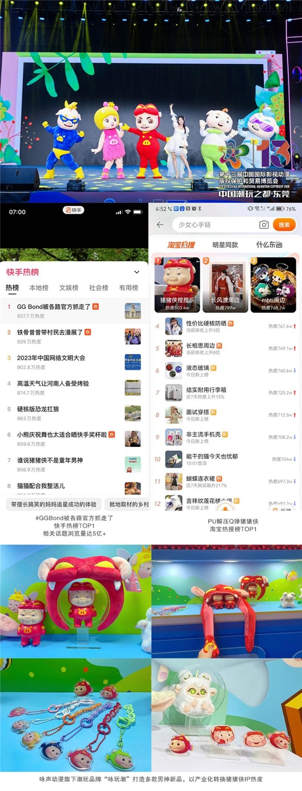 本次展會上,豬豬俠率領小伙伴們亮相國漫國潮嘉年華,精彩的現(xiàn)場表演吸引了眾多觀眾圍觀。今年,豬豬俠表情包在各大平臺高頻次曝光,眾多網(wǎng)友以自發(fā)模仿、二創(chuàng)等方式傳播GGBond表情包,男神GGBond相關話題多次登上抖音、快手、微博等各平臺熱榜。同時,詠聲動漫迅速推出相應衍生品承接熱點,實現(xiàn)營銷變現(xiàn)。