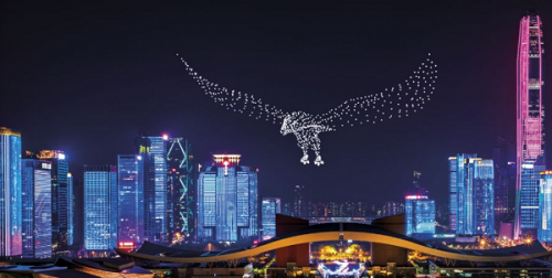 在無人機(jī)的點(diǎn)綴下,夜空中的無人機(jī)在排序布列下幻化成深圳燕子湖國(guó)際會(huì)展中心,夜空中的金花轉(zhuǎn)動(dòng)成展館形狀的禮盒,禮盒上的絲帶展開,呈現(xiàn)了本會(huì)展覽內(nèi)容豐富,精彩紛呈,這在無人機(jī)的點(diǎn)綴下,代表著深圳文化的醒獅,吐出了深圳現(xiàn)代城市的城際天際線,可以看出,深圳展現(xiàn)出了全球化、多樣性和包容性。