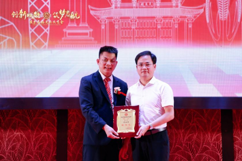 中共南安市委常委、統(tǒng)戰(zhàn)部部長蔡清安為創(chuàng)會會長黃振輝、永遠名譽會長黃坤波授牌