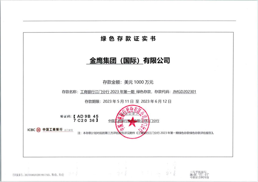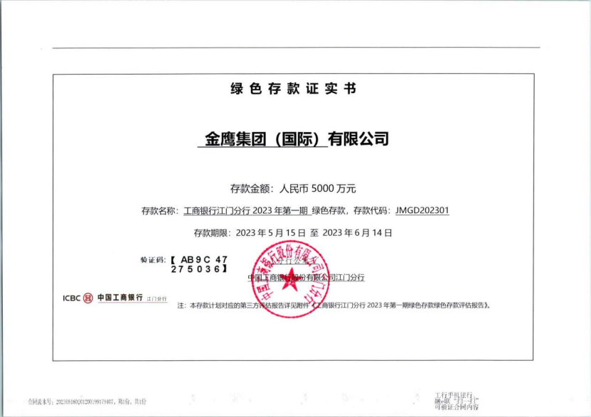 根據(jù)工商銀行江門分行的綠色存款產(chǎn)品計劃書,金鷹集團的綠色存款將主要投放到污水處理類(污水處理及收集)項目、資源綜合利用類(生活垃圾焚燒發(fā)電)項目及其他符合規(guī)定條件的綠色產(chǎn)業(yè)項目。上述項目,均已通過獨立第三方專業(yè)認證機構(gòu)——中誠信綠金科技(北京)有限公司鑒定。此外,工商銀行江門分行每半年定期向金鷹集團提供《綠色存款評估報告》,通過詳細數(shù)據(jù)追蹤資金使用情況,確保綠色存款專用于綠色項目。