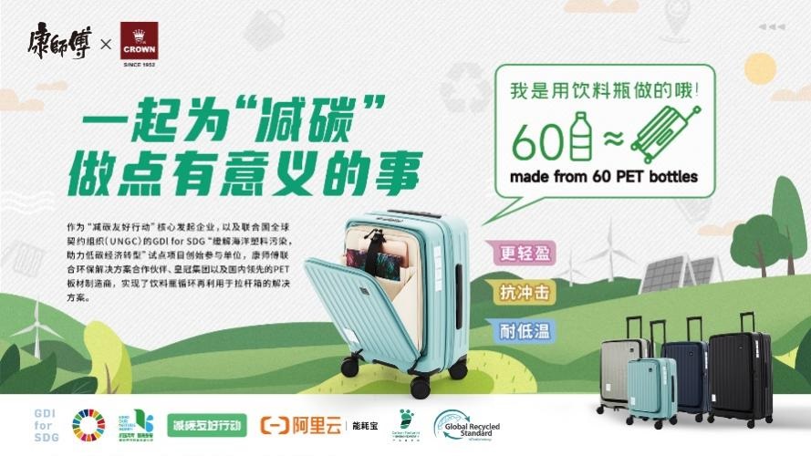 康師傅還作為主要發(fā)起單位之一攜手聯(lián)合國全球契約組織(UNGC)共同發(fā)起了GDI for SDG(全球發(fā)展倡議助力可持續(xù)發(fā)展目標)的首個試點項目——“緩解海洋塑料污染,助力低碳經(jīng)濟轉型”,與合作伙伴一道將回收的PET等使用后塑料制品,再造為多種生活消費品,又通過電商平臺的銷售推廣,實現(xiàn)循環(huán)利用。在前不久的世界地球日,康師傅與環(huán)保解決方案合作伙伴共創(chuàng),實現(xiàn)了用康師傅廢棄飲料瓶制作拉桿箱、野餐墊、收納盒等環(huán)保周邊產(chǎn)品。其中聯(lián)合旅行箱品牌CROWN皇冠,共同推出環(huán)保旅行箱,也是在電商很受追捧,成為第一個商業(yè)化的rPET項目。由于應用了專利技術,旅行箱使用的回收塑料量大,比現(xiàn)有材料更環(huán)保,而且品質(zhì)更好,無異味,更耐沖擊,耐低溫。這個項目實現(xiàn)了從塑料循環(huán)利用到商業(yè)價值鏈的良性循環(huán),讓業(yè)界看到循環(huán)經(jīng)濟模式的曙光。