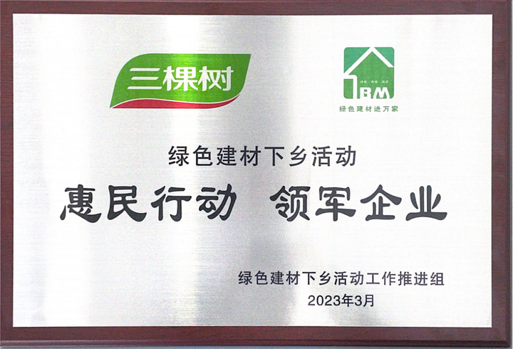 3月31日,以“綠色建材進萬家 美好生活共創(chuàng)建”為主題的全國綠色建材下鄉(xiāng)活動福建站啟動會在泉州南安舉行。三棵樹憑借綠色建材下鄉(xiāng)方面的突出貢獻獲得“綠色建材下鄉(xiāng)活動-惠民行動領(lǐng)軍企業(yè)”稱號,多款綠色產(chǎn)品獲得中國綠色建材產(chǎn)品認證證書。