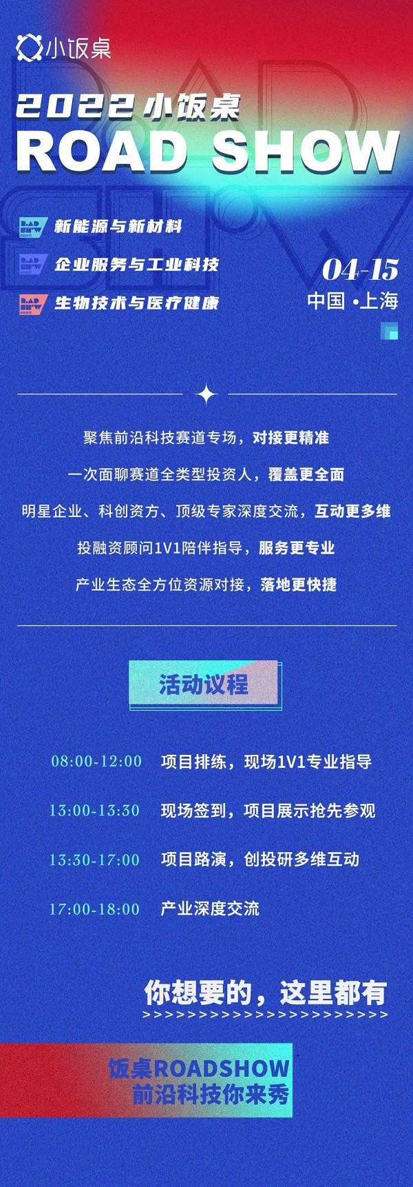導(dǎo)語(yǔ):4月15日,2022小飯桌ROASHOW將登陸上海,將開(kāi)設(shè)“新能源與新材料”、“企業(yè)服務(wù)與工業(yè)科技”、“生物技術(shù)與醫(yī)療健康”賽道專場(chǎng)路演,歡迎各位優(yōu)秀的科技創(chuàng)業(yè)者前來(lái)應(yīng)戰(zhàn)!