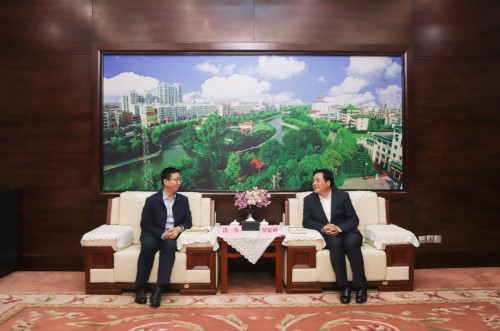 (谷倉(cāng)新國(guó)貨研究院院長(zhǎng)洪華與仙桃市委書記羅聯(lián)峰交流)