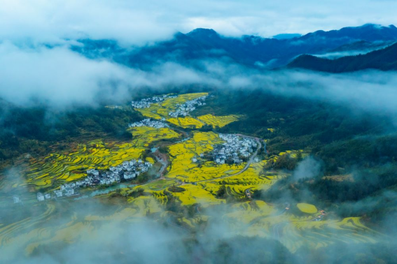 清風(fēng)吹拂金波涌,飄溢醉人濃郁香,在“中國四大花?!敝坏慕瓗X梯田,漫山遍野的油菜花隨著梯田彎曲的線條蜿蜒至遠(yuǎn)方,猶如金蛇舞動(dòng)。煙雨中的江嶺,空氣中飄散著清新的泥土氣息和油菜花的清香,置身江嶺梯田,遠(yuǎn)遠(yuǎn)望著民居與花海仿若仙,朦朧夢(mèng)幻?!@正是在婺源江嶺這幅水墨江南畫里,讓我們無比渴求的,仿佛從畫中來,帶著水墨香。