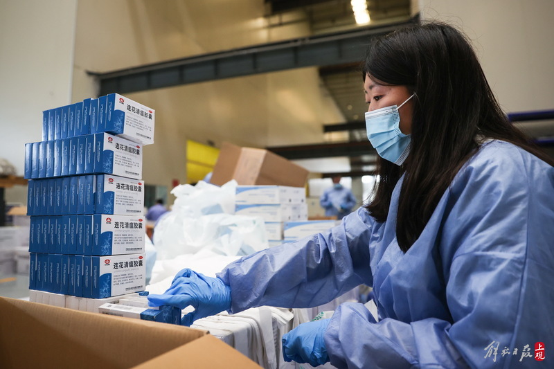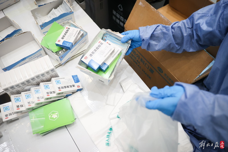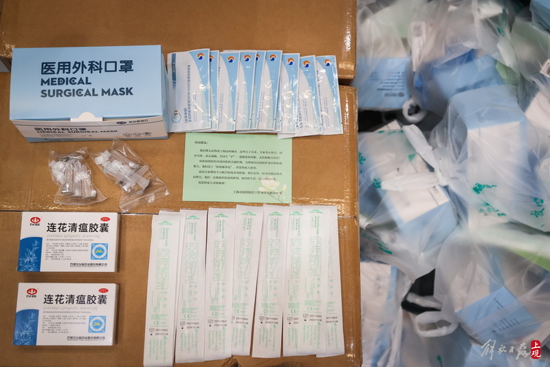 每個(gè)服務(wù)包內(nèi)有口罩、連花清瘟膠囊、抗原測(cè)試盒,并附有一張上海市疫情防控工作領(lǐng)導(dǎo)小組辦公室的心意卡。