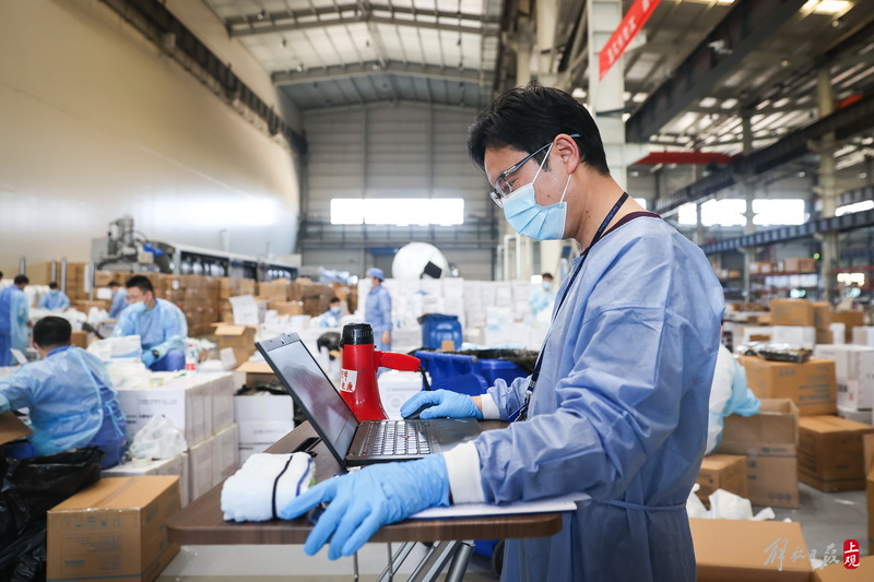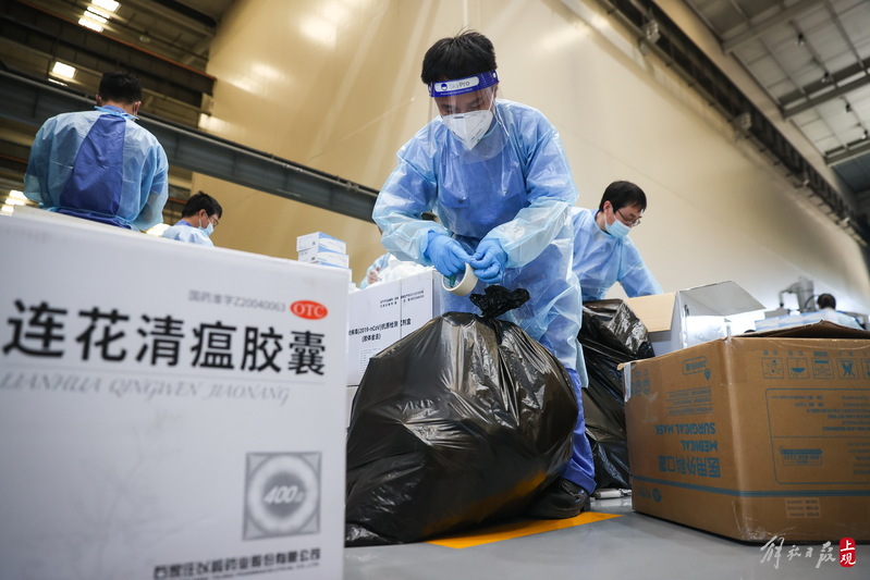 現(xiàn)場(chǎng)負(fù)責(zé)人楊東告訴記者:“我們是4月6日晚上接收到分裝任務(wù),目前累計(jì)打包送出8萬(wàn)余份‘防疫服務(wù)包’,我們從早到晚能快一點(diǎn)就快一點(diǎn),就想著盡快把物資打包好送到居民手中。”