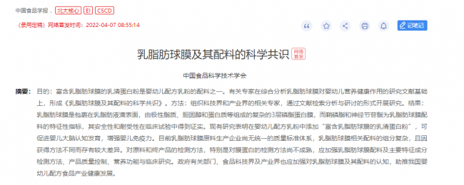 4月7日,《中國食品學(xué)報(bào)》刊發(fā)中國食品學(xué)界剛剛?cè)〉玫囊粋€(gè)突破性科學(xué)共識(shí)成果——中國工程院院士、中國農(nóng)業(yè)大學(xué)營養(yǎng)與健康研究院院長任發(fā)政等近20位中國食品科學(xué)技術(shù)學(xué)會(huì)權(quán)威專家形成了國內(nèi)首個(gè)《乳脂肪球膜及其配料的科學(xué)共識(shí)》(以下簡稱“乳脂肪球膜科學(xué)共識(shí)”),共識(shí)明確指出,嬰幼兒配方乳粉添加“富含乳脂肪球膜的乳清蛋白粉”后可促進(jìn)嬰兒大腦認(rèn)知發(fā)育、增強(qiáng)嬰兒免疫力。