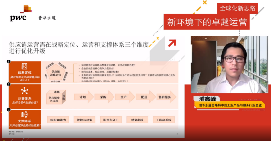 浦鑫峰表示,供應(yīng)鏈正成為企業(yè)實(shí)現(xiàn)全球增長(zhǎng)的重要手段之一,呈現(xiàn)全球化、定制化、智能化等發(fā)展趨勢(shì)。聚焦國(guó)內(nèi)眾多出海企業(yè),現(xiàn)有供應(yīng)鏈體系多面臨短期無法充分滿足海外市場(chǎng)需求、中長(zhǎng)期無法更好支撐海外業(yè)務(wù)發(fā)展以及全球化對(duì)供應(yīng)鏈運(yùn)營(yíng)提出的更高要求等挑戰(zhàn)。普華永道結(jié)合成功項(xiàng)目經(jīng)驗(yàn)及行業(yè)洞察,幫助企業(yè)通過對(duì)供應(yīng)鏈戰(zhàn)略定位、運(yùn)營(yíng)體系和支撐體系三個(gè)維度的優(yōu)化升級(jí),打造端到端卓越供應(yīng)鏈運(yùn)營(yíng)能力,提升運(yùn)營(yíng)效率、實(shí)現(xiàn)規(guī)模經(jīng)濟(jì)效益、并優(yōu)化對(duì)海外業(yè)務(wù)的管理和管控,進(jìn)一步推動(dòng)全球化業(yè)務(wù)發(fā)展。