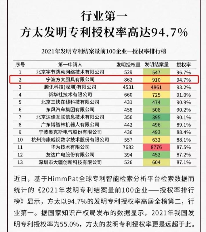 近日,基于HimmPat全球?qū)@悄軝z索分析平臺(tái)檢索數(shù)據(jù)而統(tǒng)計(jì)的《2021年發(fā)明專利結(jié)案量前100企業(yè)——授權(quán)率排行榜》顯示,廚電龍頭企業(yè)方太以94.7%的發(fā)明專利授權(quán)率高居全榜第二,行業(yè)第一。據(jù)國(guó)家知識(shí)產(chǎn)權(quán)局發(fā)布的數(shù)據(jù)顯示,2021年我國(guó)發(fā)明專利授權(quán)率為55.0%,方太的專利授權(quán)率遙遙領(lǐng)先。