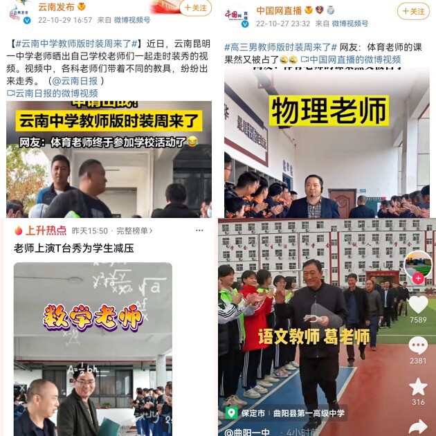 記者了解到,由于受疫情影響,不少學校采取了封控措施,為了豐富校園生活,減緩壓力,一些老師突發(fā)奇想,在校園中開展“時裝走秀”活動,并將視頻上傳至微信、微博、抖音等社交平臺,收獲了廣泛好評。之后,各地學校紛紛模仿,尤其是許多初高中任課老師“申請出戰(zhàn)”,希望通過展現(xiàn)自己的“另一面”, 讓那些背負升學壓力的同學們的緊張情緒得到有效釋放。
