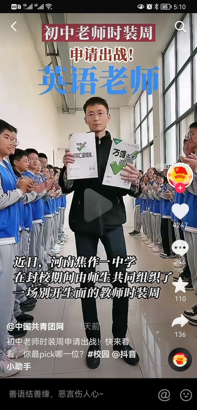 記者還注意到,“老師時裝秀”的相關(guān)視頻覆蓋面非常廣泛,在吉林、河北、河南、陜西、安徽、云南等多地校園均有出現(xiàn),其中一段河南焦作的“走秀”短視頻更是得到了中國共青團網(wǎng)抖音賬號的轉(zhuǎn)發(fā)。據(jù)悉,該視頻來源于焦作的一所初中,語文、數(shù)學、英語、物理等各科老師幾乎都參與了“走秀”,學生們在一旁喝彩鼓掌,每個人臉上都洋溢著歡樂的笑容。
