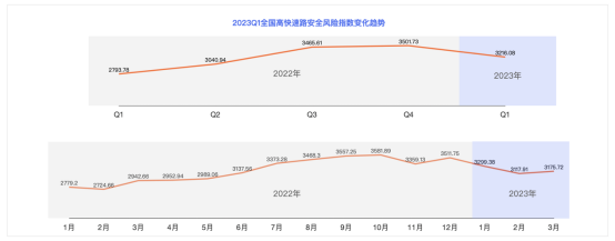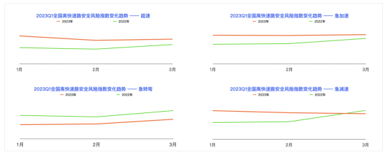 數(shù)據(jù)顯示,全國高快速路的安全險指數(shù)環(huán)比2022第四季度下降8.16%,全國高快速路的危險駕駛行為(即三急一超:急加速、急減速、急轉(zhuǎn)彎和超速)與2022第一季度比較,超速、急轉(zhuǎn)彎的變化趨勢一致,急加速、急減速則在2023年3月呈現(xiàn)下降向好趨勢。