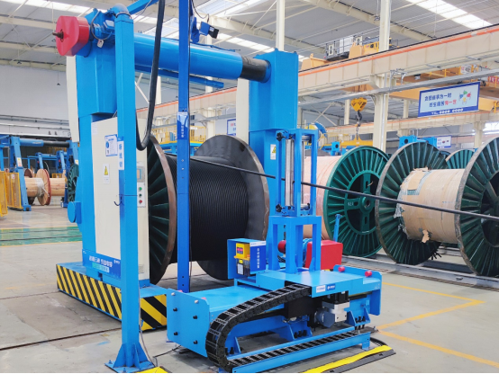 藍色自行小車把巨大的電纜軸送到既定位置,黃色的機械臂將線軸卡好,設(shè)備啟動后線纜開始自動纏繞,一盤整齊的電纜線慢慢成型。車間里,紅、黃、藍、白色的機械臂、自行小車等機械設(shè)備分工合作,有條不紊地生產(chǎn)。諾大的廠房中,零星行走著幾位身著藍色工裝、頭戴安全帽的工作人員。
