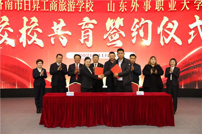 隨后,濟(jì)南市日昇工商旅游學(xué)校執(zhí)行校長(zhǎng)管玉川與山東外事職業(yè)大學(xué)產(chǎn)教融合辦公室主任張榮家成功簽署校校共育協(xié)議。