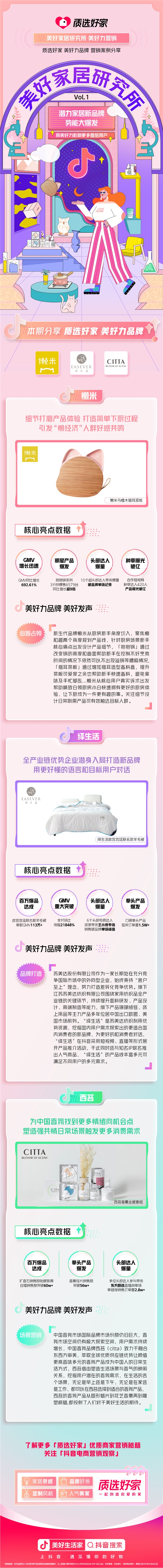 「質(zhì)選好家」喊出「一起創(chuàng)造你愛的家」這句口號一方面是對自己的要求另一方面也是對用戶的美好希冀,海量家居內(nèi)容、嚴(yán)格把控品質(zhì)、定制風(fēng)格隨心選、人氣創(chuàng)作者同款推薦,從選品、風(fēng)格、品控到營銷抖音電商消電家居行業(yè)「質(zhì)選好家」一方面可以幫助優(yōu)質(zhì)家居品類商家提高品牌信賴度,深度連接更多消費者,另一方面借由平臺個性化信息觸達與分發(fā)機制為消費者提供一站式家居相關(guān)商品網(wǎng)購解決方案,讓消費者更輕松獲取家居購物靈感,用美好家居單品輕松裝扮自己的家。
