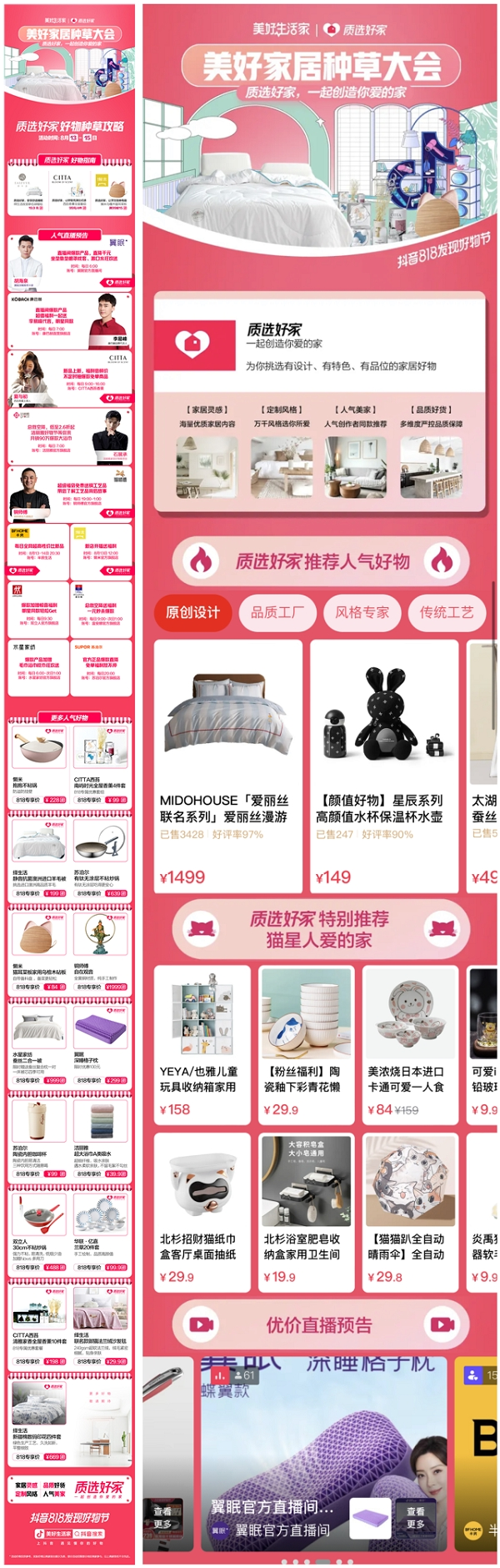818活動伊始,抖音電商消電家居行業(yè)發(fā)起的美好家居種草大會便吸粉無數(shù),「質(zhì)選好家」通過家居行業(yè)的有趣互動話題配合人氣同款品質(zhì)好物推薦、口碑設(shè)計師專業(yè)好價等選品指導(dǎo)內(nèi)容,打通「從需求產(chǎn)生到商品銷售爆發(fā)」的體驗鏈路,一系列的家居話題探討:衛(wèi)生間搭配什么收納更能搭配你家的整體風(fēng)格,一個收納空間怎么就一舉兩得成為了居家咖啡館,選一個枕頭如何讓你的睡眠質(zhì)量更好,養(yǎng)貓人選什么樣的沙發(fā)套更合適?......是「質(zhì)選好家」挖掘用戶需求心聲后給予用戶的美好家居購買提案,「質(zhì)選好家」讓商家不再只是商品的提供者,而是在以家為場景的消費路徑中聯(lián)合商家為消費者提供更多新消費靈感,讓消費者更容易找到自己真正適合的商品,找到適合自己的一站式家居解決方案。同時將對于家的美好向往通過商品售賣提供給消費者,真正實現(xiàn)「質(zhì)選好家」與消費者「一起創(chuàng)造你愛的家」的內(nèi)核訴求。