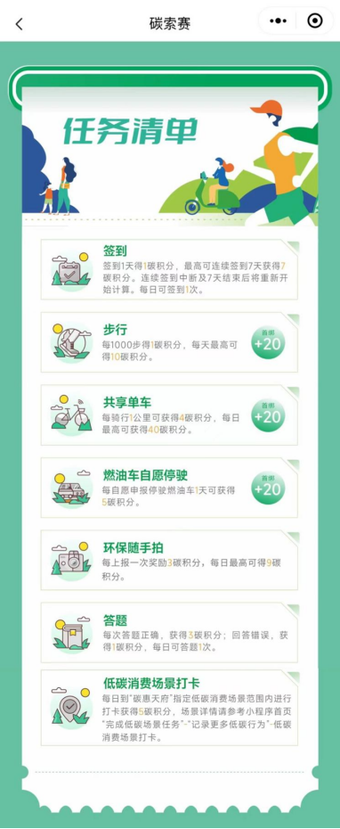 “出行碳索賽”作為亮點活動之一,更是讓人眼前一亮。10日25日起,通過微信進入“碳惠天府”小程序,踐行包括每日步行、騎共享單車、自愿停駛?cè)加蛙?、環(huán)保隨手拍、低碳消費場景打卡等多種綠色低碳任務,均能獲得相應的碳積分。