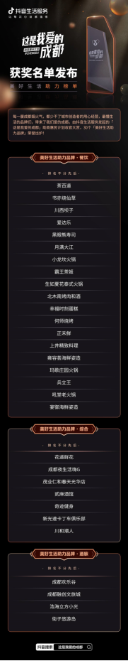 2022年11月4日,由抖音生活服務(wù)發(fā)起的「這是我愛的成都」助商惠民計(jì)劃收官大賞,以一場「這是我愛的成都·美好生活助力榜單」榮譽(yù)發(fā)布,對活動期間為成都播撒生活美好的30個(gè)品牌和10位達(dá)人做出總結(jié)與嘉獎(jiǎng)。