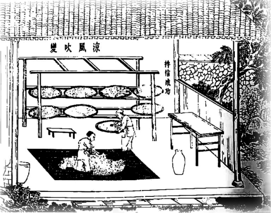 釀酒必須要用酒曲作為酒引子,沒有酒曲,即便有好米好黍也釀不出酒。為了釀出好的酒曲,宋應(yīng)星記錄道:“用楮葉包扎,懸風(fēng)處,或用稻秸罨黃,經(jīng)四十九日取用?!鼻摇吧S未足,視候不勤,盥拭不潔,則疵藥數(shù)丸動(dòng)輒敗人石米?!币馑际侵魄诵栌心托那壹?xì)心,要時(shí)常查看酒曲的發(fā)酵情況,營造適宜酒曲發(fā)酵的環(huán)境。