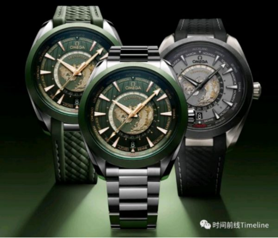 這款世界時的細節(jié)在于,內表盤的海洋顏色與手表配色一致,鈦殼是灰色、鋼殼是綠色;陸地則采用激光技術進行著色,金色是高海拔地區(qū)。其中鈦金屬表盤的黑灰色都是由激光歐米茄的地圖是以北極為中心的北半球,我們可以注意到,地圖帶有微微的弧形效果,模仿了真實的地球曲率。盤面上帶地圖的表不少,但像歐米茄做的這么細致真實的,極少。