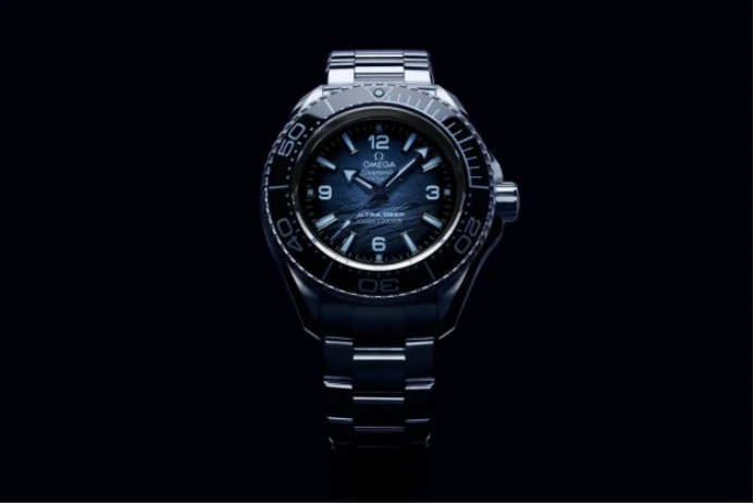 這次歐米茄海馬75周年紀念款的表盤,雖然每一款的質感都不同,卻都采用了漸變藍色的暈染效果,歐米茄稱之為“Summer Blue”。但是根據每個款式所能承載的下潛深度不同,表盤采用的藍色色調也不同,基本上對應照光層,弱光層,深海層,深淵層的不同深度下海水呈現的效果。比如6000米已經到了海底的深淵層,這個深度是需要探照燈照明的,那海洋宇宙Ultra Deep 6000M專業(yè)潛水表表盤的藍也就更加深邃,幾乎接近黑色。