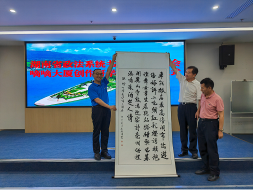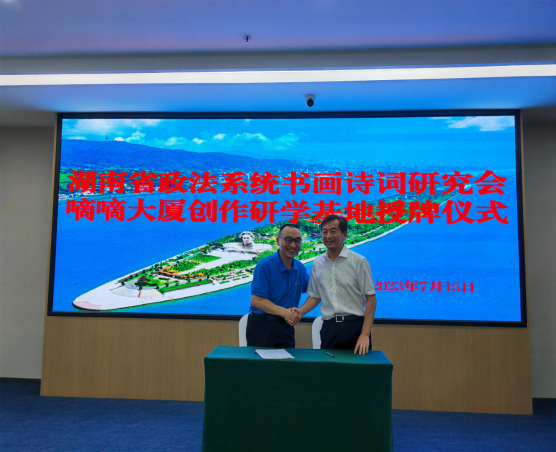 詩以言志,文以化人。以法護商,以商促文。7月15日上午,坐落于長沙市芙蓉區(qū)“中央文化區(qū)”的嘀嘀大廈五樓會議室高朋滿座,熱鬧非凡?!昂鲜≌ㄎ幕粥执髲B創(chuàng)研基地”簽約暨掛牌儀式在此隆重舉行。省政法系統(tǒng)書畫詩詞研究會主席團成員彭對喜,副會長劉慶富;詩詞分會主席陳嶺及副主席賀曦、周加良、江世炎;書法分會主席陳祥松、副主席吳若順;長沙法官文聯(lián)副主席胡軍軍等領(lǐng)導和嘉賓出席活動。