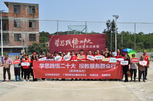 4月25日-26日,深交所聯(lián)合海通證券、廣西證券期貨基金業(yè)協(xié)會、證券時報舉辦的“學(xué)思踐悟二十大 投教服務(wù)啟新程”投資者服務(wù)專項活動走進廣西欽州市浦北縣。在深入開展學(xué)習(xí)新時代中國特色社會主義思想主題教育之際,以多載體、多角度、多形式走進鄉(xiāng)村小學(xué)、村間打谷場、田間地頭、紅色教育基地,以群眾喜聞樂見的方式展開面對面宣傳交流,推動投資者教育服務(wù)進一步走進鄉(xiāng)村基層,助力鄉(xiāng)村振興。